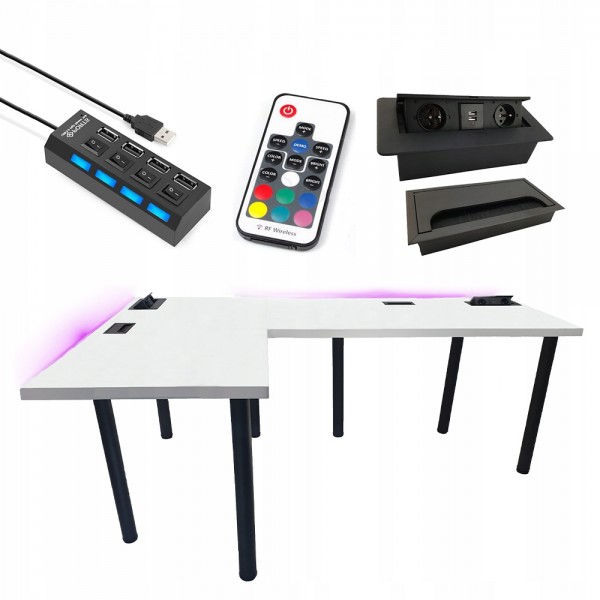 - Blat|Nogi|2xLedy |2xPrzepust kablowy|2xGniazdo 2x 230v 2x USB|2x4x HuB USB