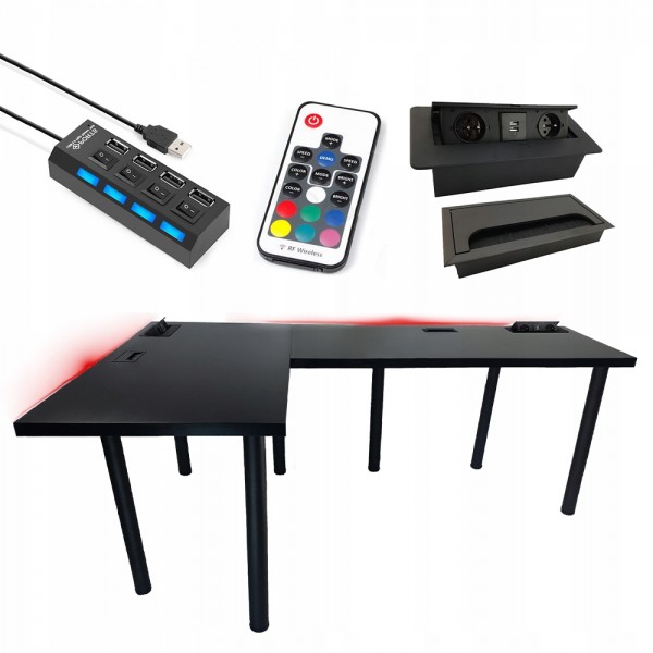 Blat|Nogi|2xLedy|2xPrzepust kablowy|2xGniazdo 2x 230v 2x USB|2x4x HUB USB