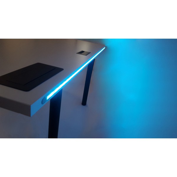 Biurko zostało wyposażone w designerską taśmę LED, która prezentuje się niezwykle estetycznie dzięki wpuszczeniu bezpośrednio w blat. LEDY posiadają aż 20 kolorów i 20 efektów świetlnych do wyboru! W zestawie otrzymasz pilot do zdalnego sterowania kolorami. Dodatkowo taśma jest wodoodporna - o nic nie musisz się martwić!